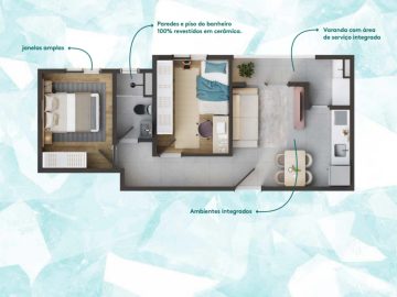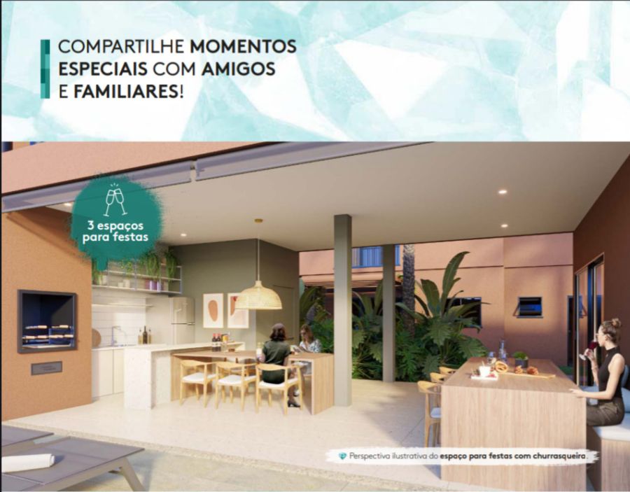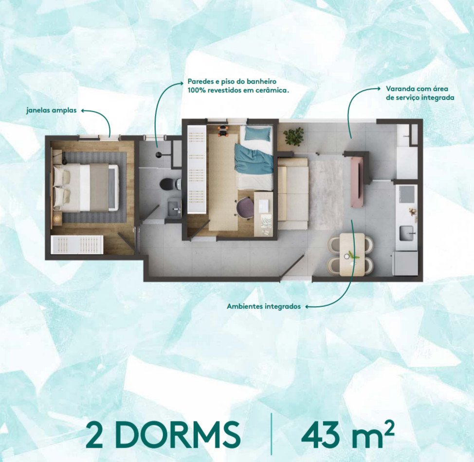 Apartamento de 42 m² com 2 dormitórios, terraço, vaga de garagem e lazer completo.